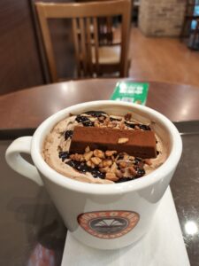ホットチョコレートに生クリームが加わって、なめらかで甘味もしっかりあります。