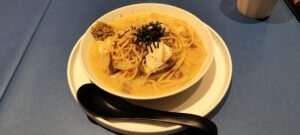 • 和風スープパスタはパンチがあり、締めのご飯まで計算された構成です